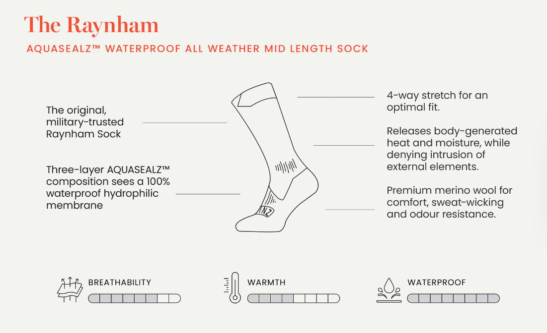 S inovativnom Hydrostop™ tehnologijom, prodiranje vode u čarapu je spriječeno, a srednja dužina pruža dodatnu toplinu i zaštitu nogama. Izdržljive, lagane i prozračne, čarape Raynham pružaju stopalima suhoću i udobnost tijekom cijelog dana.