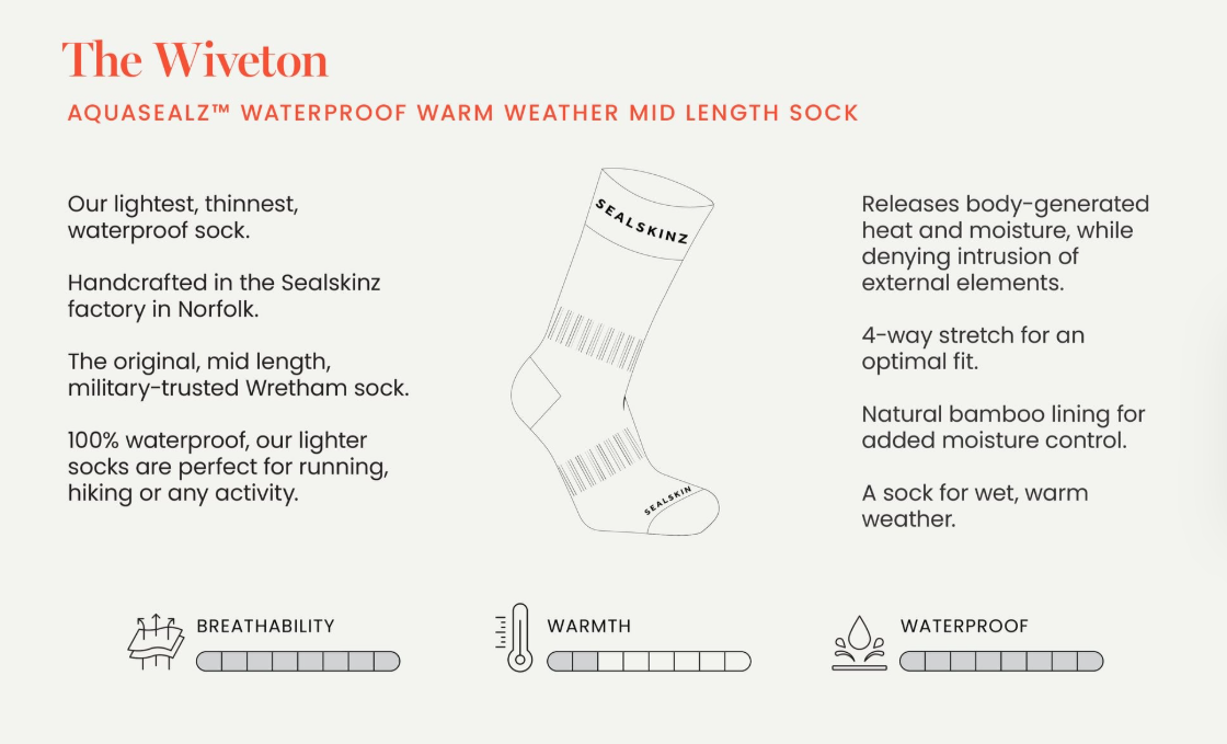 Sealskinz Wiveton WP Warm Weather Mid Sock GREY predstavljaju najlakše i najtanje vodootporne čarape iz Sealskinz kolekcije. Dizajnirane za toplije vremenske uvjete, ove čarape kombiniraju 100% vodootpornost i prozirnu prozračnost zahvaljujući Aquasealz™ tehnologiji, koja učinkovito odvodi višak topline i vlagu. Idealne su za trčanje, planinarenje ili intenzivne aktivnosti, pružajući maksimalnu udobnost, zaštitu i slobodu kretanja.