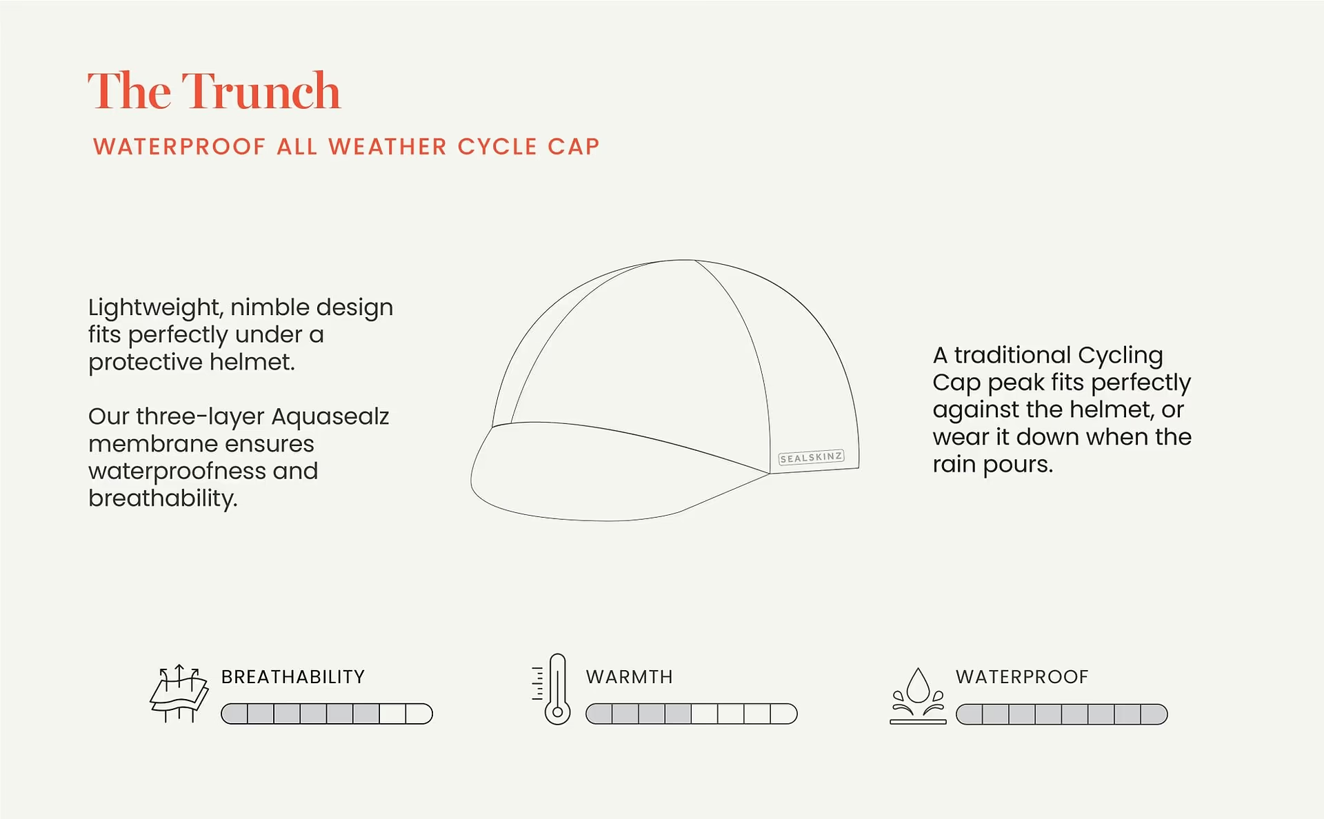 SealSkinz Trunch je lagana i vodonepropusna biciklistička kapa, izrađena s troslojnom Aquasealz™ tehnologijom koja pruža 100% zaštitu od vode, uz zadržavanje potpune prozračnosti. Zahvaljujući kompaktnom i prilagodljivom dizajnu, savršeno pristaje ispod biciklističke kacige te omogućuje udobnu vožnju u svim vremenskim uvjetima.