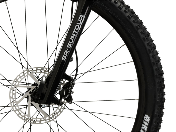 • Prednja vilica Suntour NVX30 s hodom od 100 mm učinkovito upija neravnine i poboljšava udobnost na neravnim terenima. Hidraulične disk kočnice omogućuju sigurno i snažno kočenje u svim vremenskim uvjetima, bilo da se vozite po kiši, blatu ili suhim šumskim stazama.