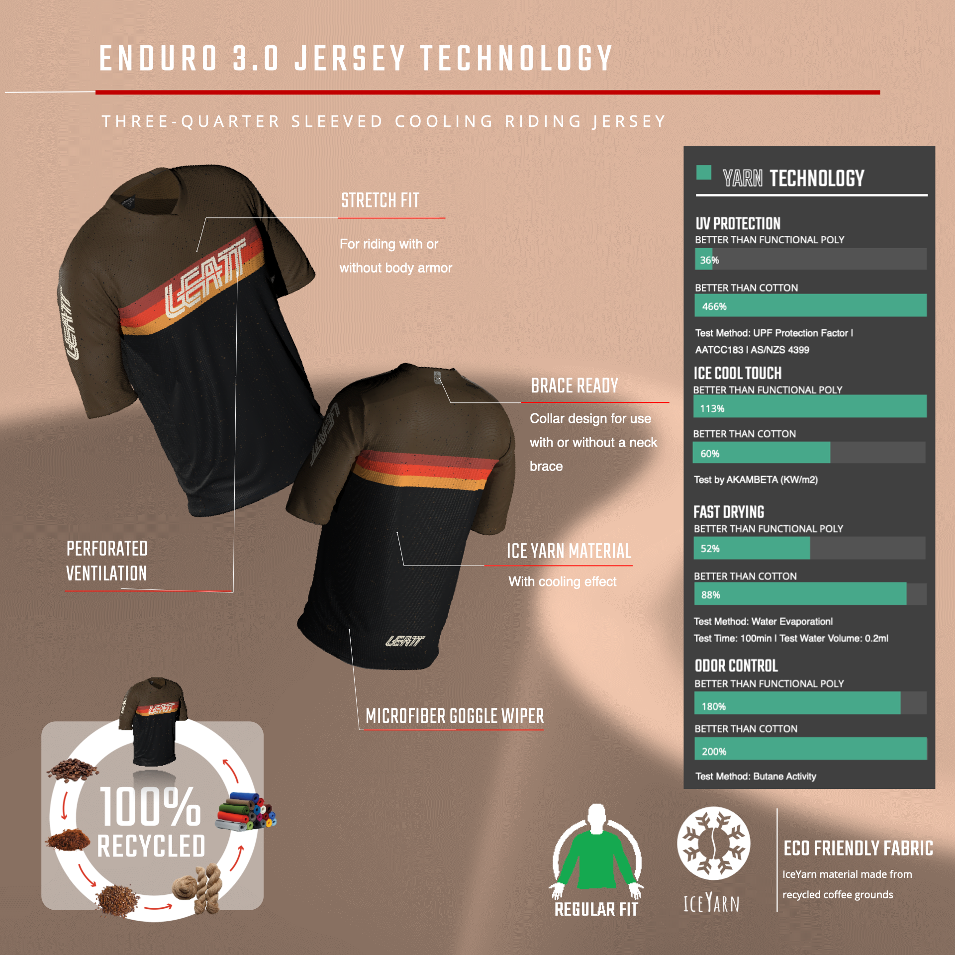 Leatt Enduro 3.0 majica s tričetvrt rukavima dizajnirana je za vožnje koje traže izdržljivost, udobnost i učinkovitu termoregulaciju tijekom cijelog dana. Zahvaljujući inovativnoj IceYarn tkanini izrađenoj od recikliranih ostataka kave, ova majica pruža efekt hlađenja na dodir, iznimnu prozračnost i brzo sušenje – čak 200 % brže od pamuka i 50 % brže od poliestera.