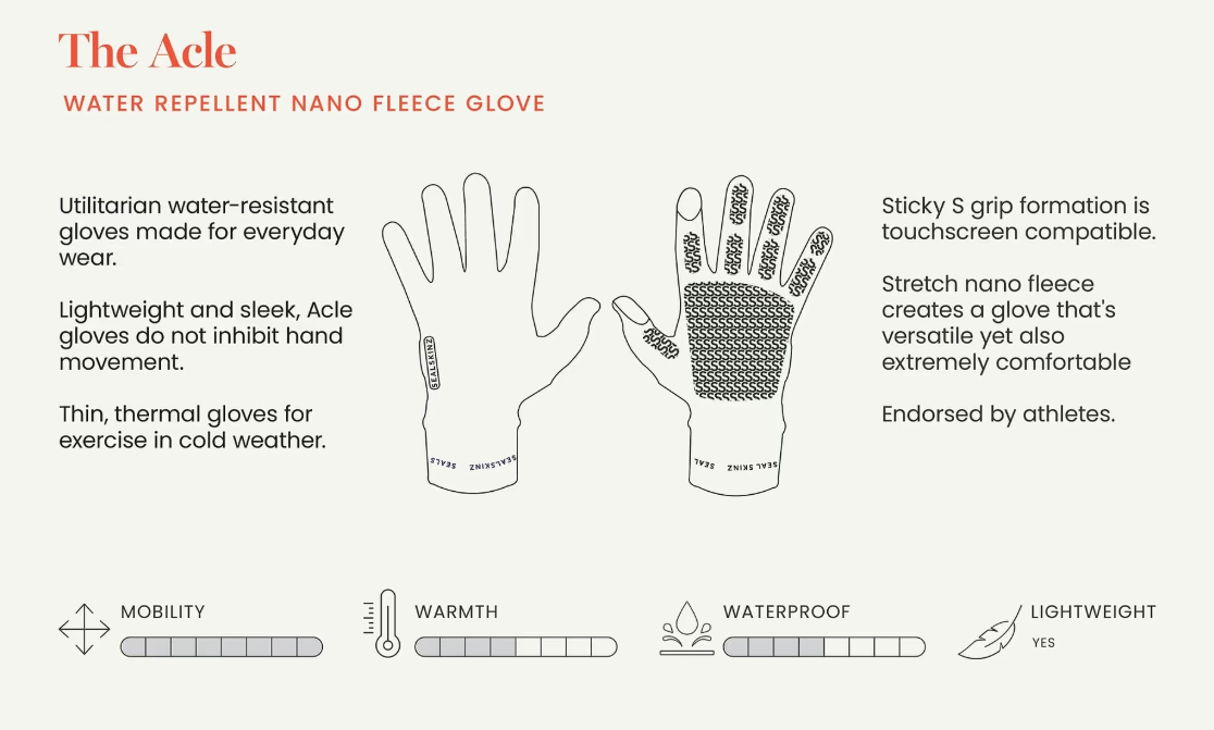 Sealskinz Acle rukavice izrađene su od laganog i toplog flisa s NanoSealz™ vodoodbojnom tehnologijom, što ih čini idealnim izborom za svakodnevnu upotrebu i aktivnosti na otvorenom. Rukavice su tanke, termoizolacijske i prozračne, pa pružaju zaštitu od hladnoće bez narušavanja pokretljivosti.